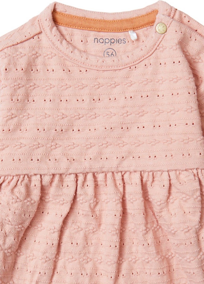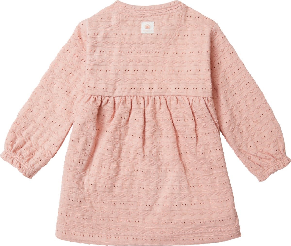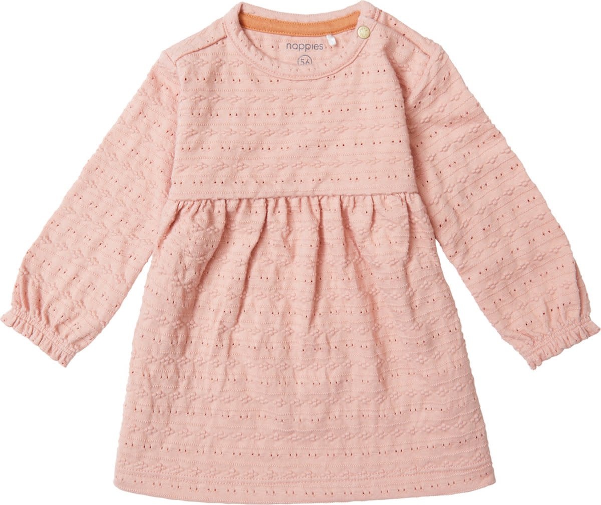 Hello cute! Jurkje Carmela van Noppies Baby heeft een mooie broderiewerkje in de stof en elastische mouwboorden wat zorgt voor een subtiel pofeffect. Het jurkje valt losjes en is aangenaam luchtig. Perfect voor de lente- en zomermaanden waarin de temperatuur nog weleens wisselt. In de halslijn zit een drukknoopje waardoor verkleden en verschonen net even makkelijker gaat. Fijn!