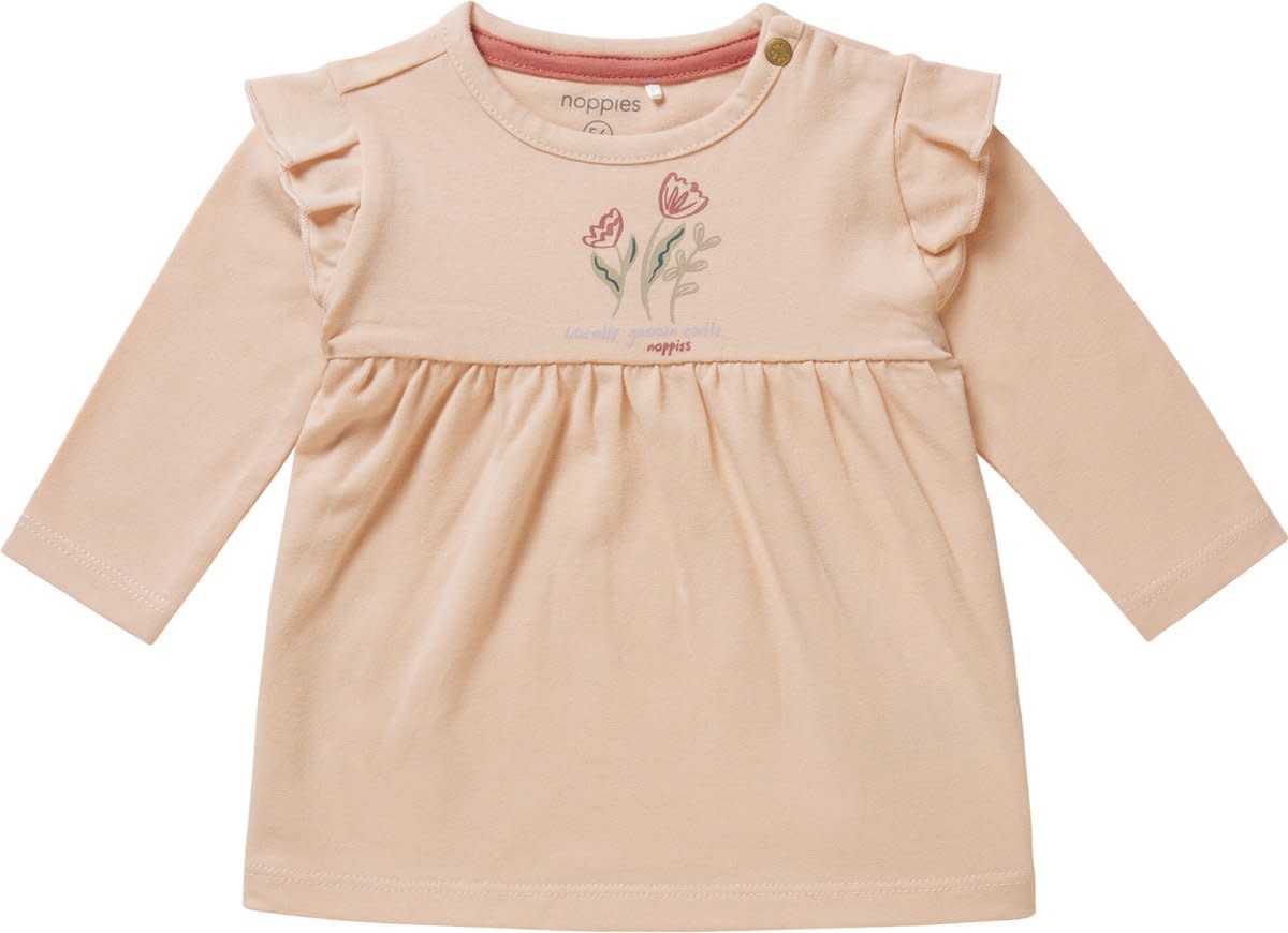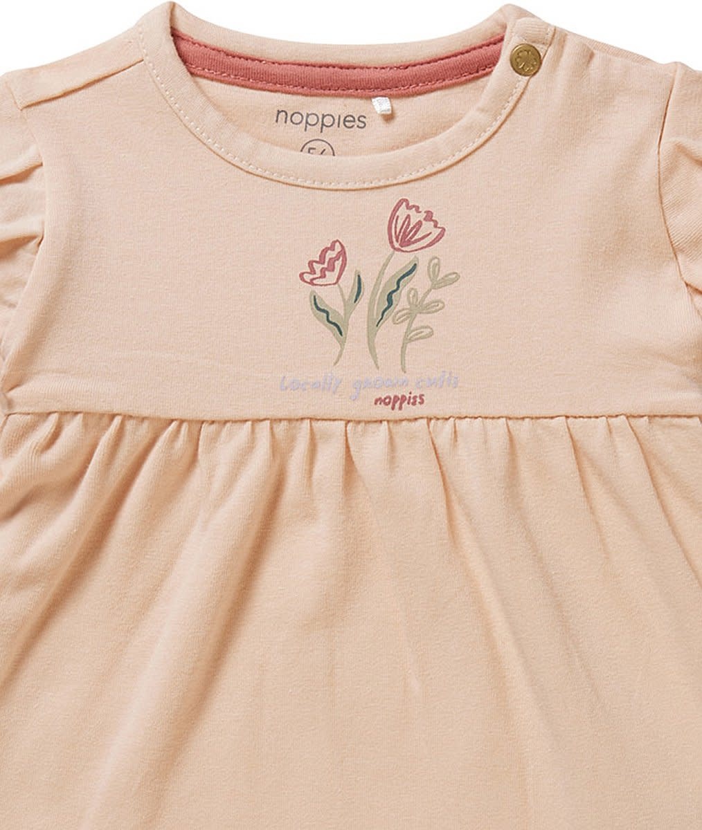 Hey there cutie! Jurkje Champlin van Noppies Baby heeft een schattige opdruk en ruffeltjes op de schouders. De drukknoopjes op de schouder maken verkleden en verschonen net even makkelijker. Fijn! Het zachte stretchy stofje is heerlijk voor je kindje om te dragen. Het jurkje heeft ons 'soft feel'-label: zachter dan dit wordt het niet! Deze extra zachte stof voelt aangenaam op het kwetsbare huidje van je kind.