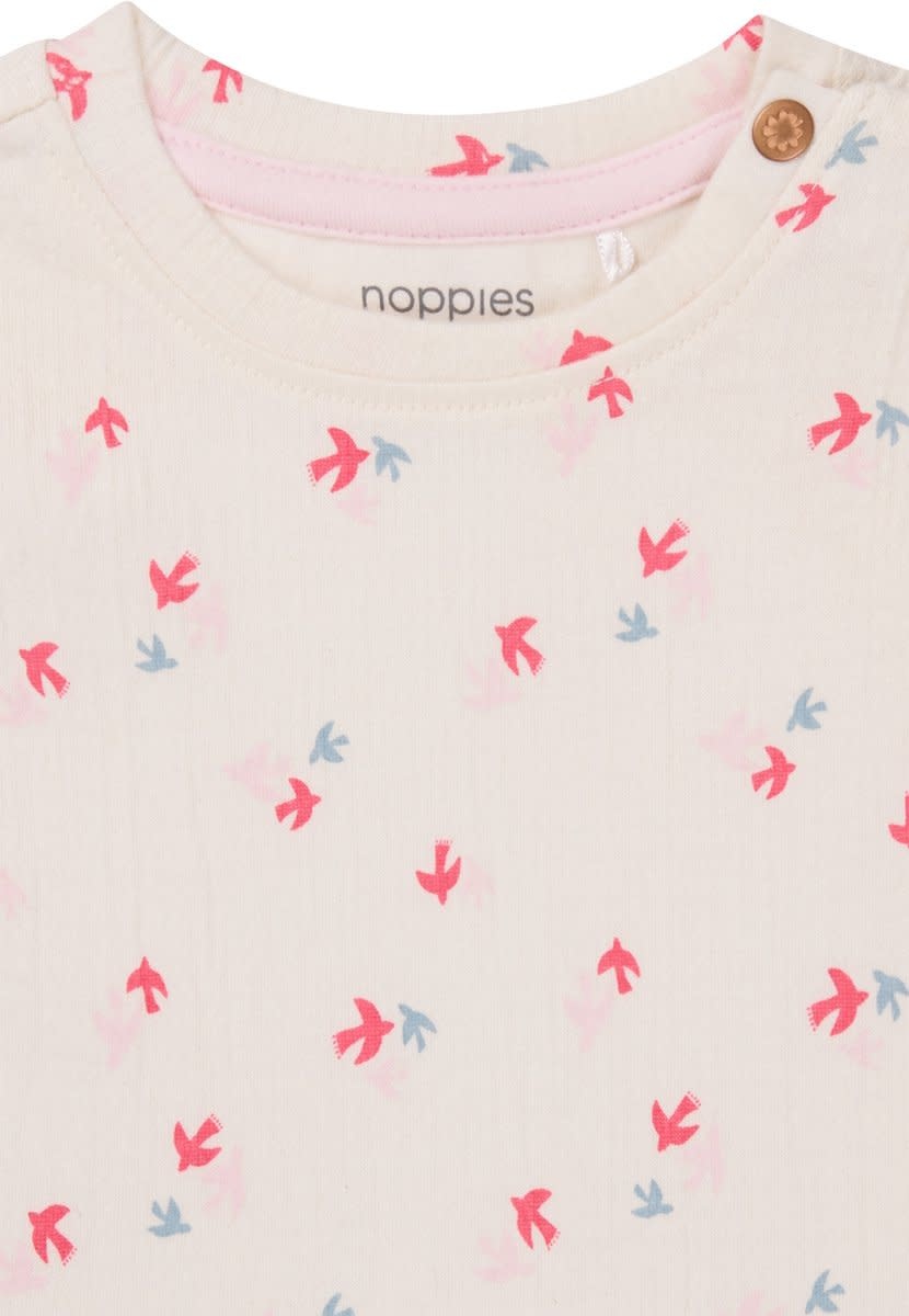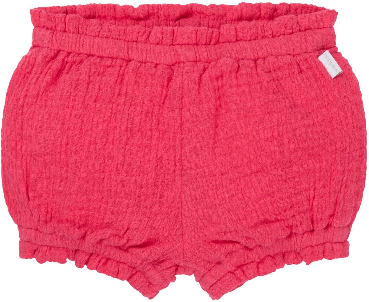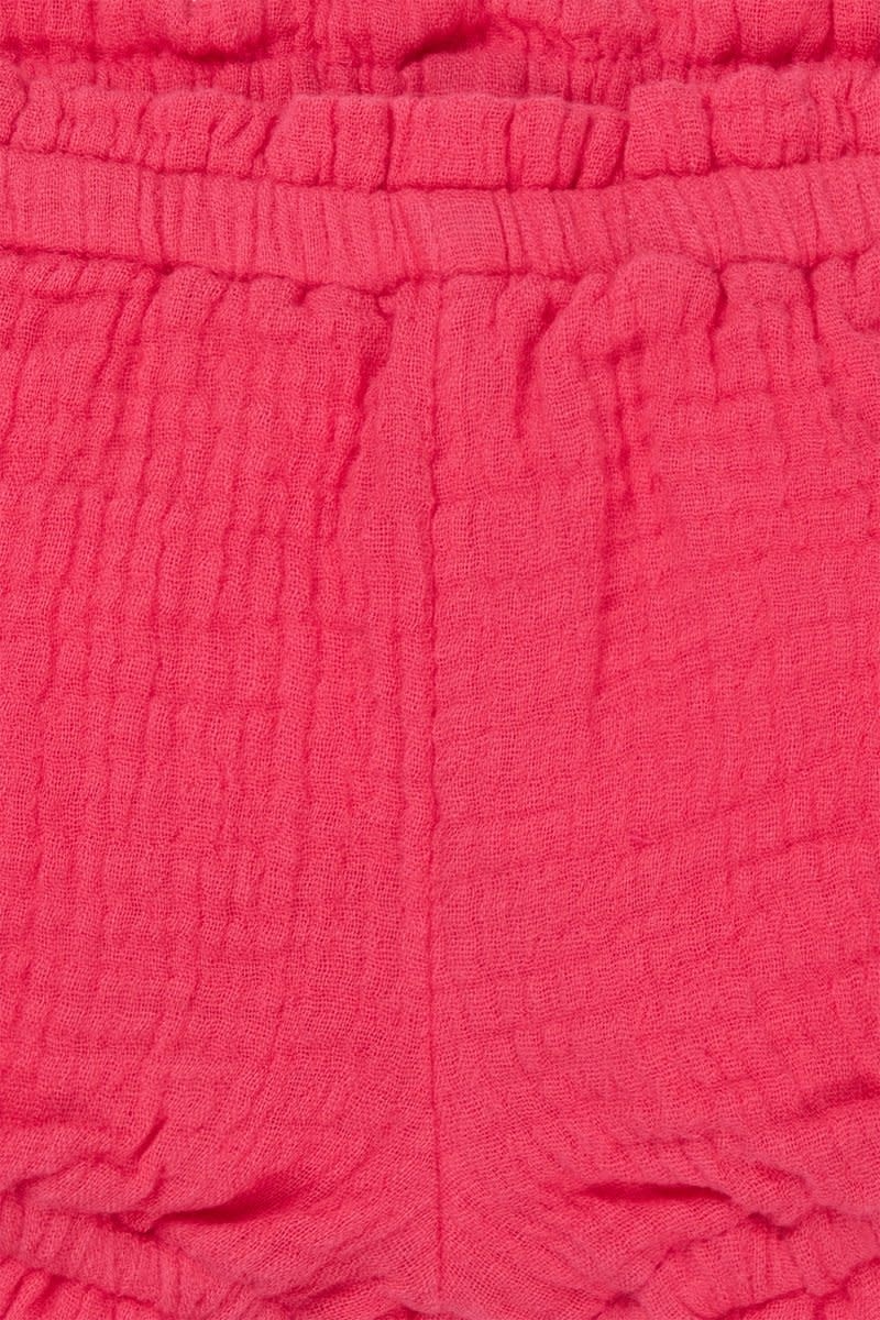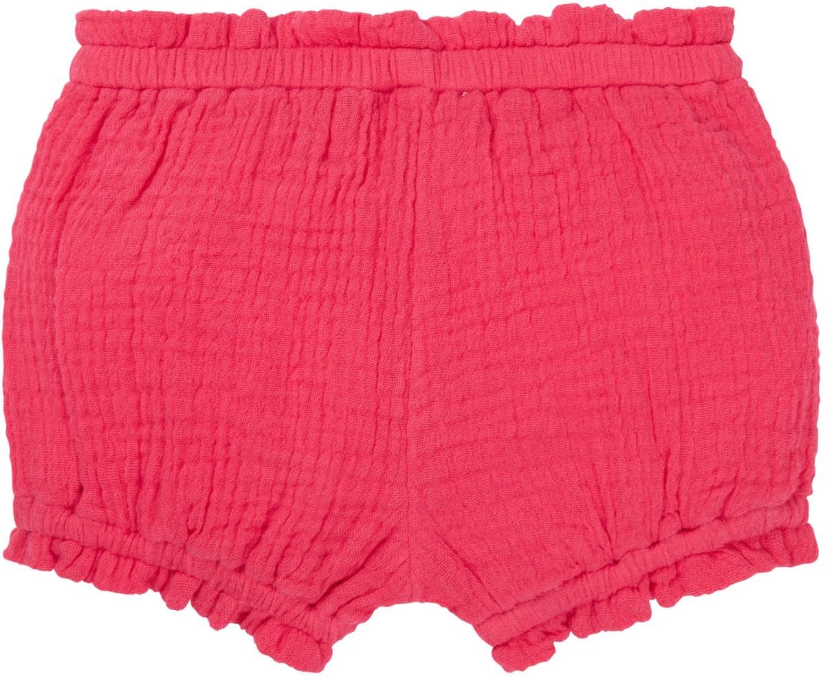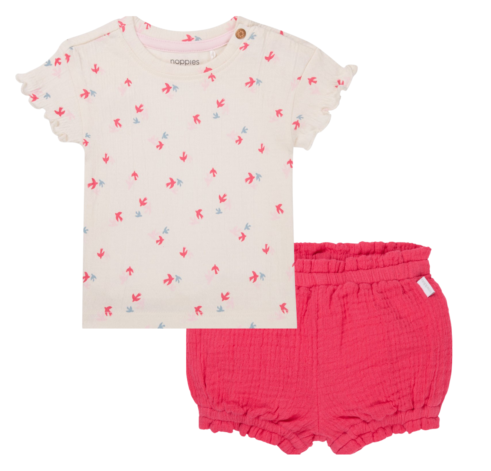 Het shirtje heeft een ronde hals met druk knoopje en het shortje heeft een elastische band. Dus lekker makkelijk aantrekken.